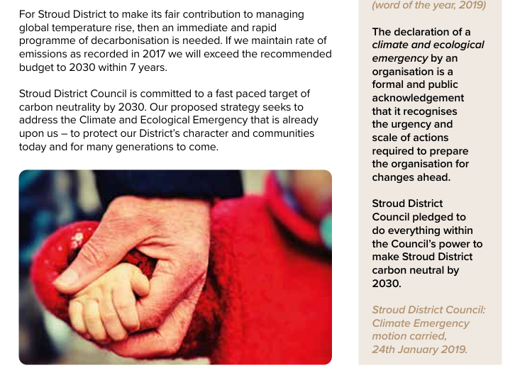 The latest Council plan is available here – Stroud District Council, the 2030 Strategy Limiting, Adapting, Recovering and Responding in a Changing Climate with review now underway.